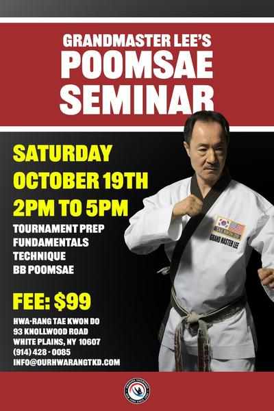 As you may know, many students from our school will be participating in the ATMA Championship Tournament on Saturday, November 9th in Greenwich, CT. In order to prepare, Grandmaster Lee, from Hwa-Rang Tae Kwon Do, will be hosting a Poomsae Seminar. Please find the details below: