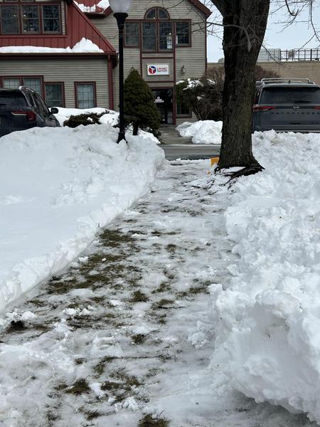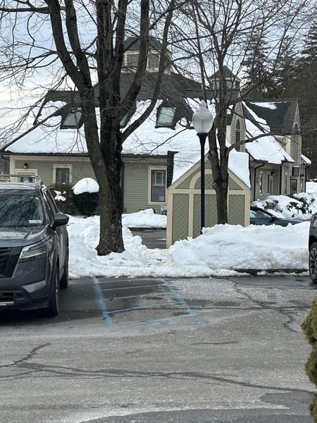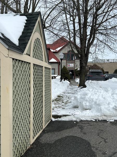 a clear walking path from their lot directly to ours. The path is located on the right side of the shed in their parking lot and leads straight through to our front door. For added convenience and safety, there is also a light in our parking lot above the path to help when it gets dark.